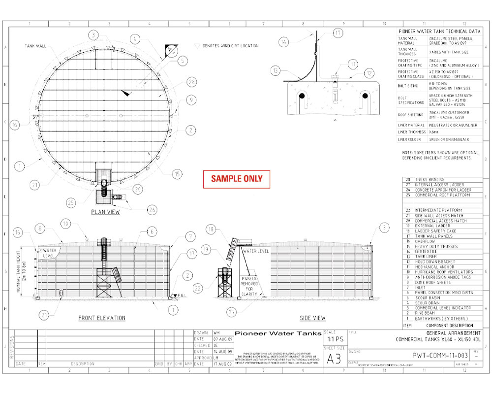Living Water Industries installs steel bolted water tanks across a broad range of diameters, wall heights, and storage capacities. From compact residential systems to fully engineered commercial and fire protection tanks, our sizing capabilities ensure each project is designed for performance, compliance, and long-term scalability.