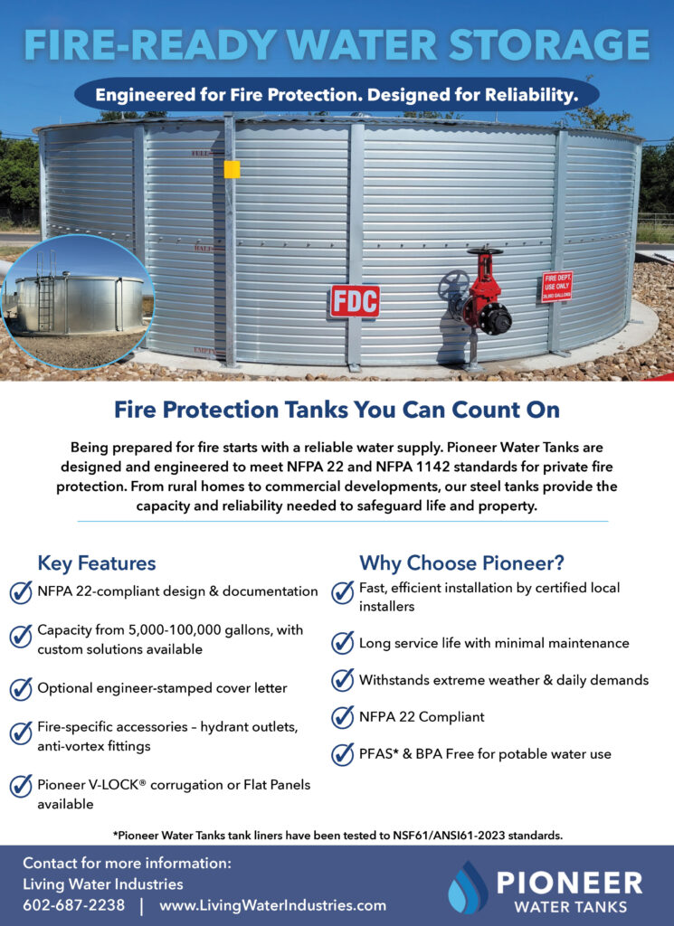 Steel fire water tanks are commonly used in agricultural and remote locations where access to municipal water systems is limited or unavailable. Living Water Industries installs fire protection water tanks that provide essential emergency water storage for ranches, farms, and rural properties throughout Arizona, delivering dependable fire water storage solutions designed for challenging site conditions.